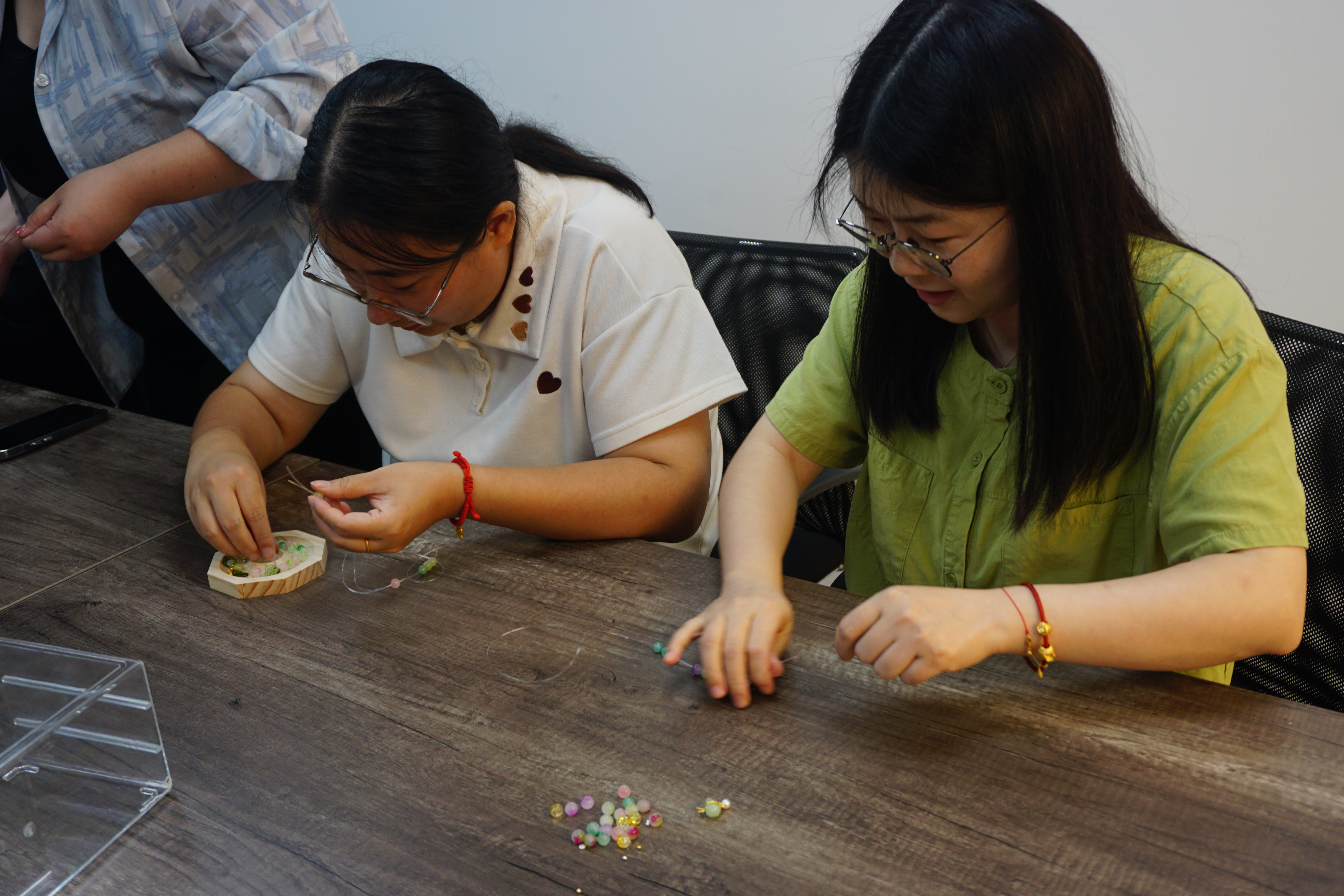 手工串珠活動的現(xiàn)場,員工們則化身為手工藝人,親手編織屬于自己的國風手串。大家認真挑選珠子、搭配絲線,每一款手串都承載著對傳統(tǒng)文化的敬意與傳承。完成作品后,大家紛紛展示自己的成果,并互贈祝福,傳遞著中秋的溫情與喜悅。