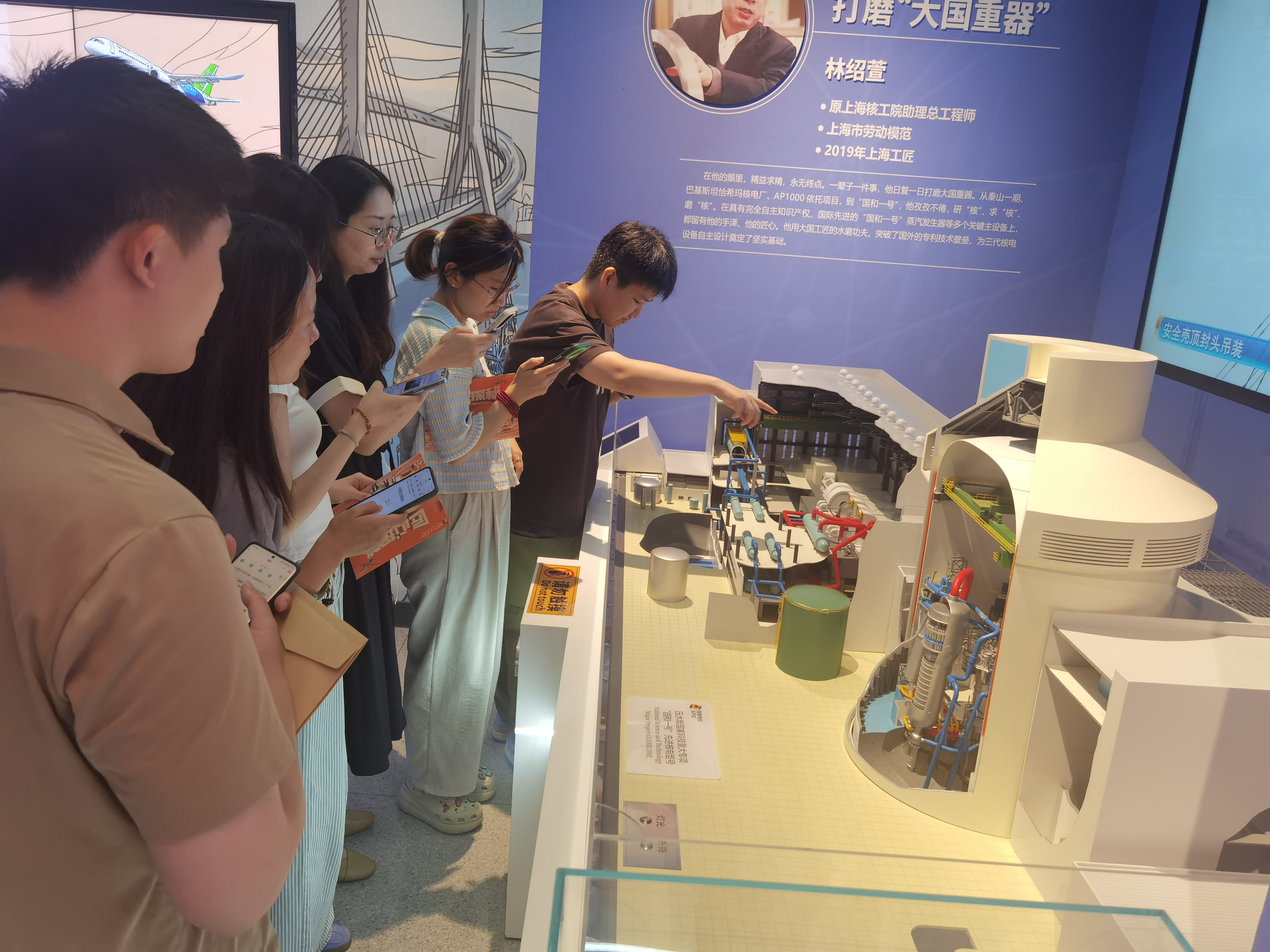 在工作人員的引導(dǎo)下,參與者們穿梭于各個(gè)展區(qū)之間,現(xiàn)場(chǎng)感受“嚴(yán)謹(jǐn)認(rèn)真、精益求精、追求完美、勇于創(chuàng)新”的工匠精神。展館內(nèi)以實(shí)物、模型、多媒體、互動(dòng)等展示方式,展示了紡織機(jī)、工具磨床、玉兔二號(hào)、北橫通道盾構(gòu)、981鉆井平臺(tái)、萬(wàn)噸水壓機(jī)等150余件實(shí)物或模型,在講解員的講述下,大家聆聽(tīng)了包起帆、李斌、徐小平、王軍、胡雙錢(qián)、王曙群等上海工匠的故事,感受工業(yè)生產(chǎn)的魅力與工匠們的辛勤付出。