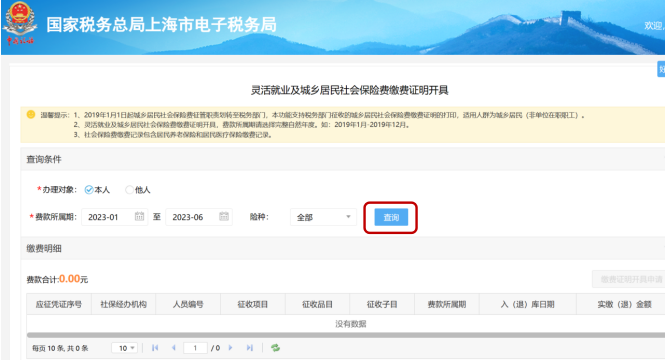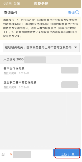 3、點擊【查詢】,開具本人證明或代開他人繳費證明