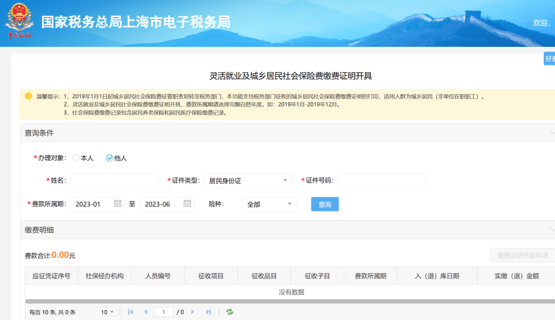 為他人打印繳費證明,【辦理對象】選擇“他人”,并輸入繳費人信息,選擇相應費款所屬期后,點擊【查詢】。