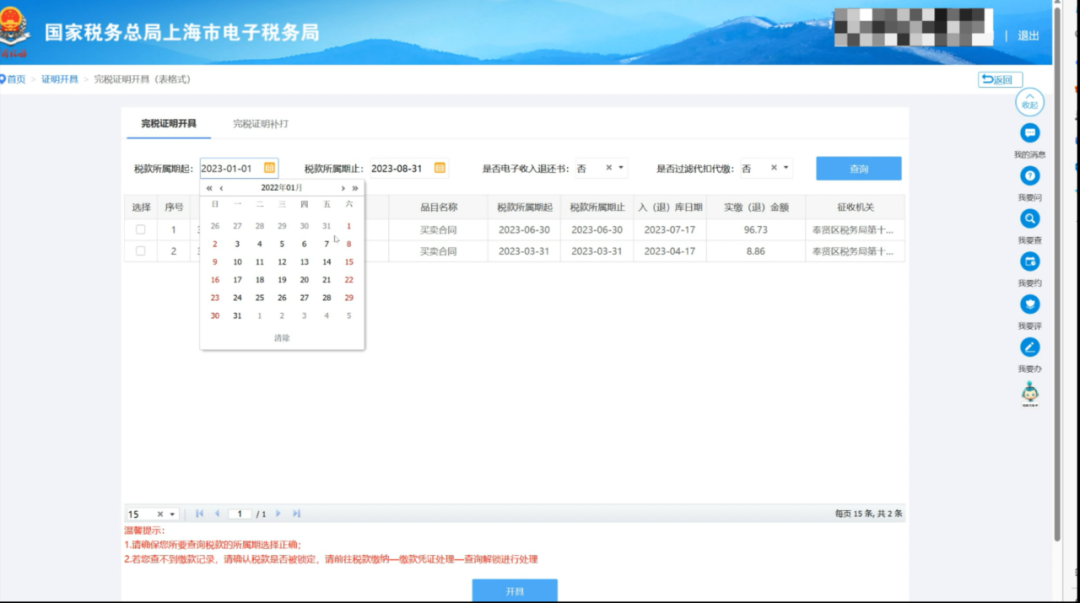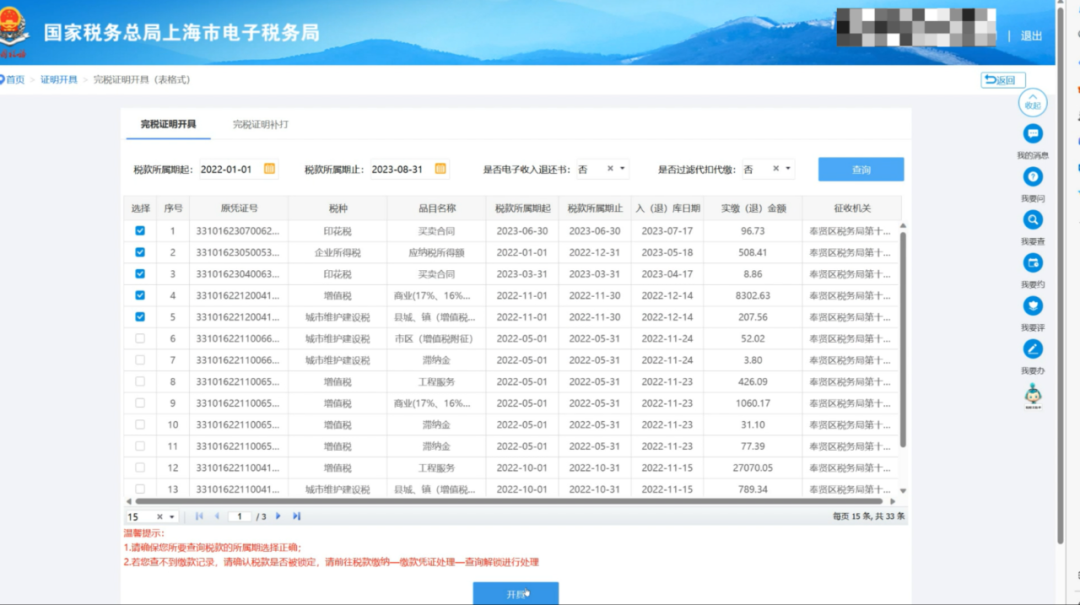 第二步:勾選需要開具的憑證,確認后點擊“開具”,下載完稅證明即可。