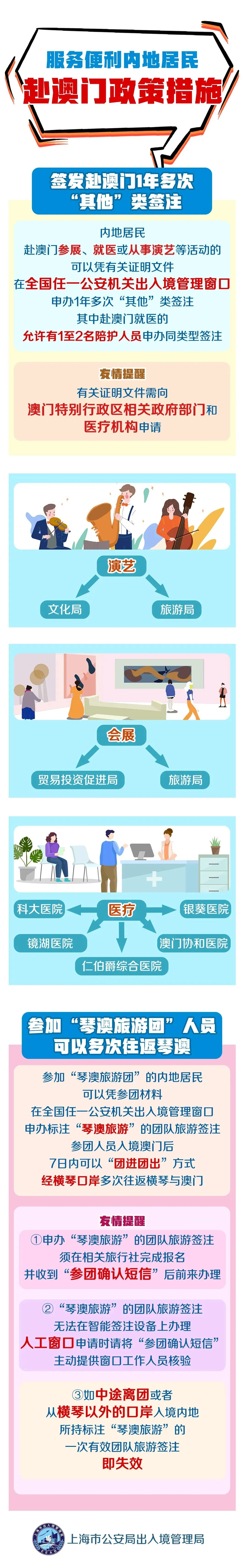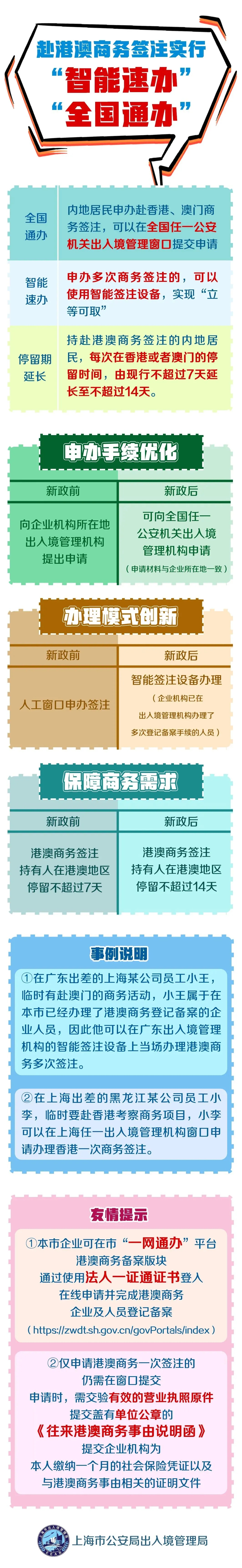 國(guó)家移民管理局公告自2024年5月6日起實(shí)施若干便民利企出入境管理政策措施。其中,上海啟動(dòng)實(shí)施赴港澳人才簽注政策,并作為試點(diǎn)城市之一,先行先試部分出入境證件“全程網(wǎng)辦”,港澳商務(wù)簽注實(shí)行“智能速辦”“全國(guó)通辦”,服務(wù)便利內(nèi)地居民赴澳門(mén)政策措施同步施行……