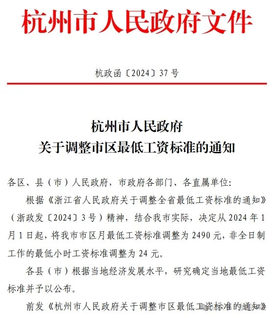 根據(jù)《浙江省人民政府關(guān)于調(diào)整全省最低工資標(biāo)準(zhǔn)的通知》(浙政發(fā)〔2024〕3號)精神,結(jié)合我市實際,決定從2024年1月1日起,將我市市區(qū)月最低工資標(biāo)準(zhǔn)調(diào)整為2490元,非全日制工作的最低小時工資標(biāo)準(zhǔn)調(diào)整為24元。
