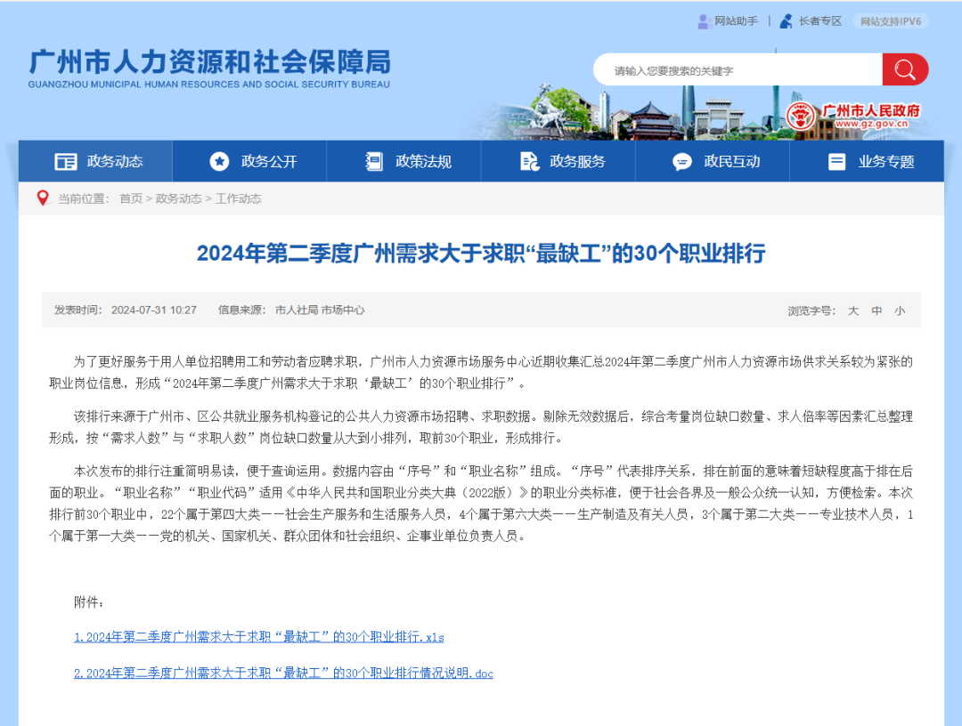 為了更好服務于用人單位招聘用工和勞動者應聘求職,廣州市人力資源市場服務中心近期收集匯總2024年第二季度廣州市人力資源市場供求關系較為緊張的職業(yè)崗位信息,形成“2024年第二季度廣州需求大于求職‘最缺工’的30個職業(yè)排行”。