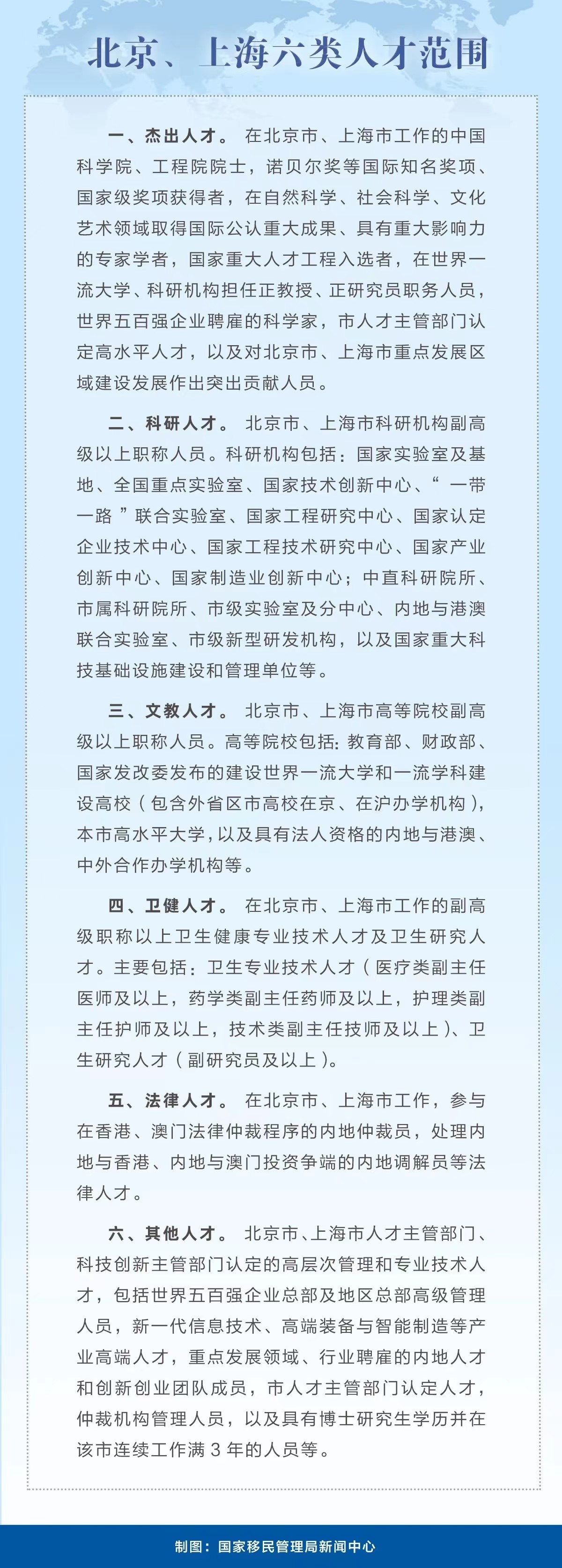 三、北京、上海六類(lèi)人才可以申辦赴港澳人才簽注。將赴港澳人才簽注政策由粵港澳大灣區(qū)內(nèi)地城市擴(kuò)大至北京、上海。在北京、上海工作的杰出人才、科研人才、文教人才、衛(wèi)健人才、法律人才以及管理人才等六類(lèi)人才,可以憑有關(guān)人才證明,單獨(dú)或者同時(shí)申請(qǐng)辦理有效期1至5年不等的多次赴香港和赴澳門(mén)人才簽注,每次在香港或者澳門(mén)停留不超過(guò)30天。
