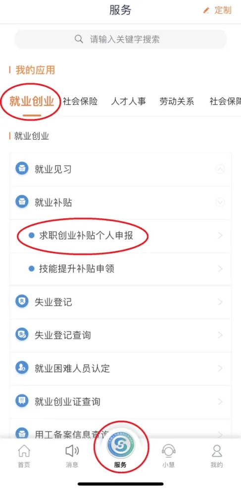 注冊并登錄“江蘇智慧人社”APP,選擇“服務(wù)”—“就業(yè)創(chuàng)業(yè)”—“就業(yè)補貼”—“求職創(chuàng)業(yè)補貼個人申報”。